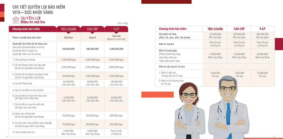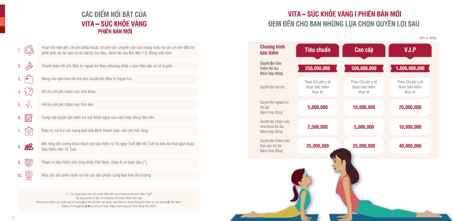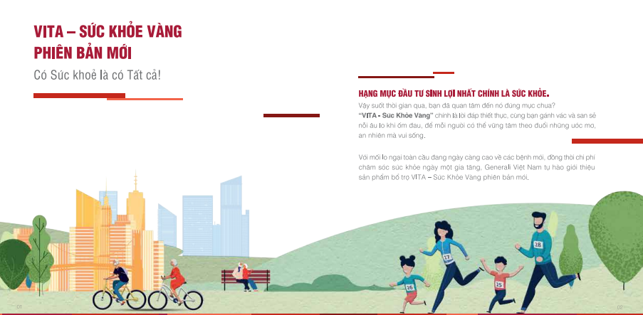 VITA - Sức Khỏe Vàng là sản phẩm chiến lược của công ty. Với phương châm "Có Sức Khỏe là có Tất Cả", chính vì vậy Generali đưa ra nhiều quyền lợi bảo vệ cao cho khách hàng, với hạn mức lên đến 1 tỷ/năm, phạm vi bảo hiểm rộng khắp Toàn Cầu, có giá trị tích lũy chứ không mất hẳn đi, và đặc biệt thời gian bảo vệ lên đến 70 tuổi mà không cần thẩm định lại sức khỏe hàng năm